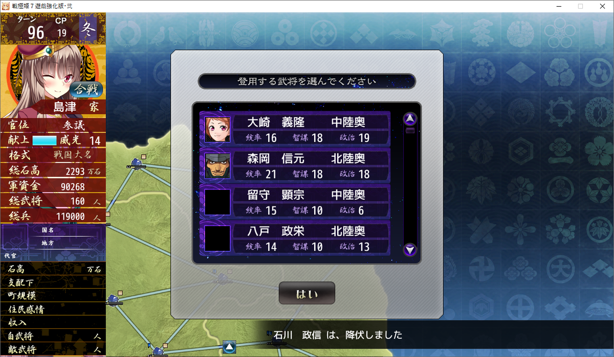 この86ターン目で津田景康、松平元康、金地院崇伝の3人がレベル極になりました。