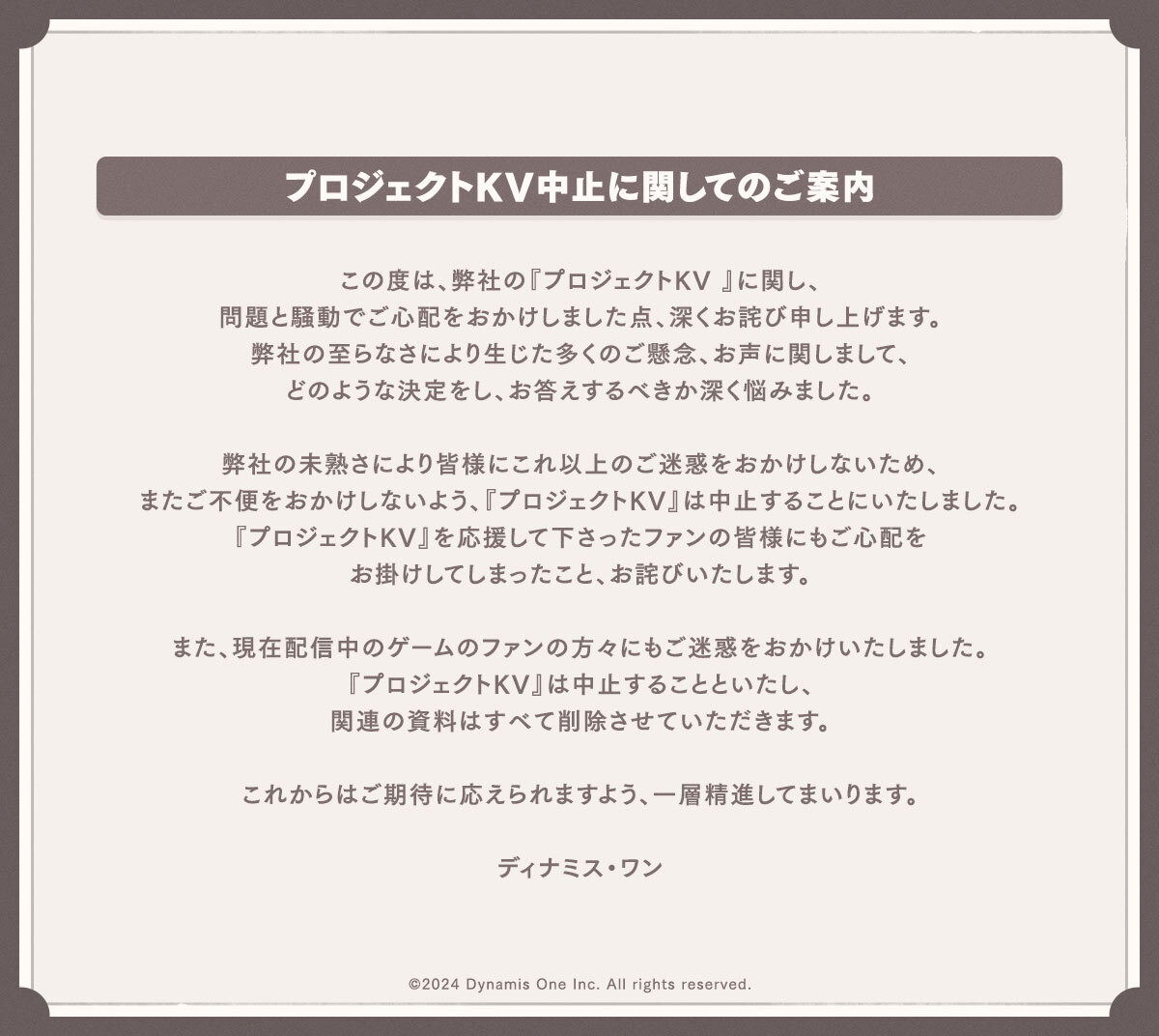本日9/8の19時ごろに「Dynamis One(ディナミス・ワン)」が手がけていた「プロジェクトKV」の開発中止が公式より発表されました。