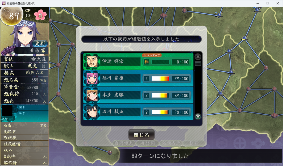 更新フェイズで久しぶりの朝廷の使者が来て、右大臣の官位が与えられて威光が18に上がりました。